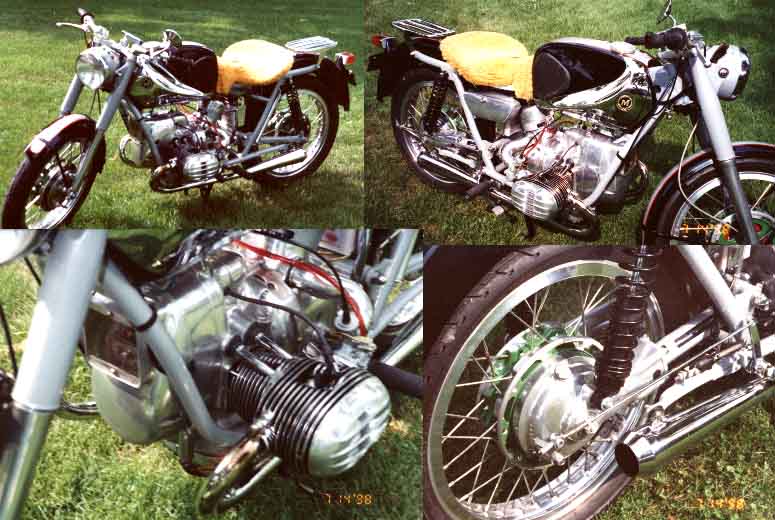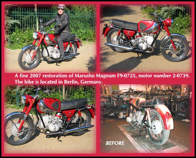 Nicely restored 1966 Marusho Magnum owned by Philippe of France; ex-Great Britain and winner of Best in Show at Staffordshire in 1992. At the same time the bike, along with my 1961 Lilac MF-39 and other classic bikes, was videotaped for broadcast on the Shizuoka Broadcast System. Frame number F9-0708, motor number 2-0716. Photos by the owner. Another excellent photo of this bike is available on the 500cc bike history Web page.