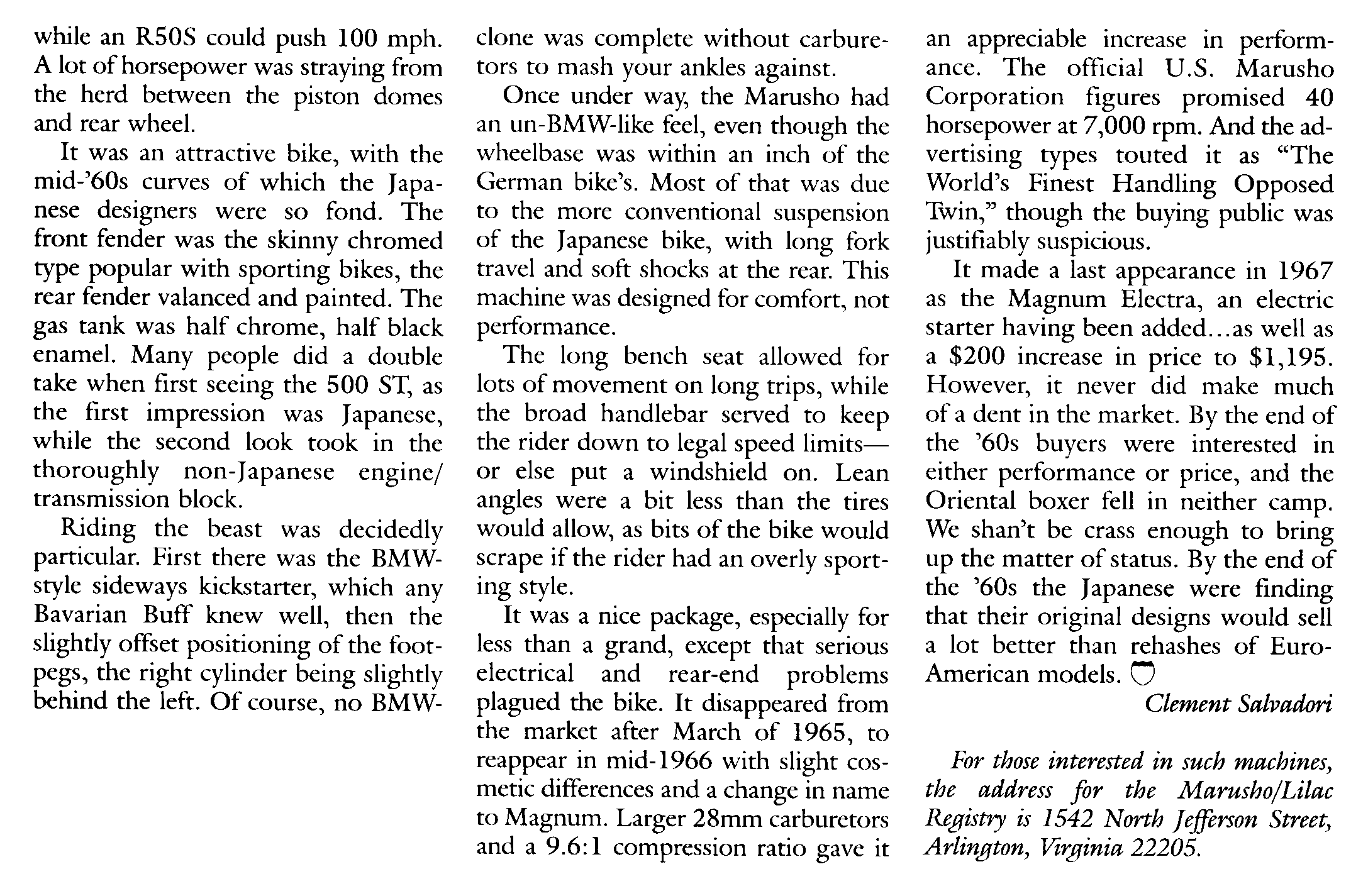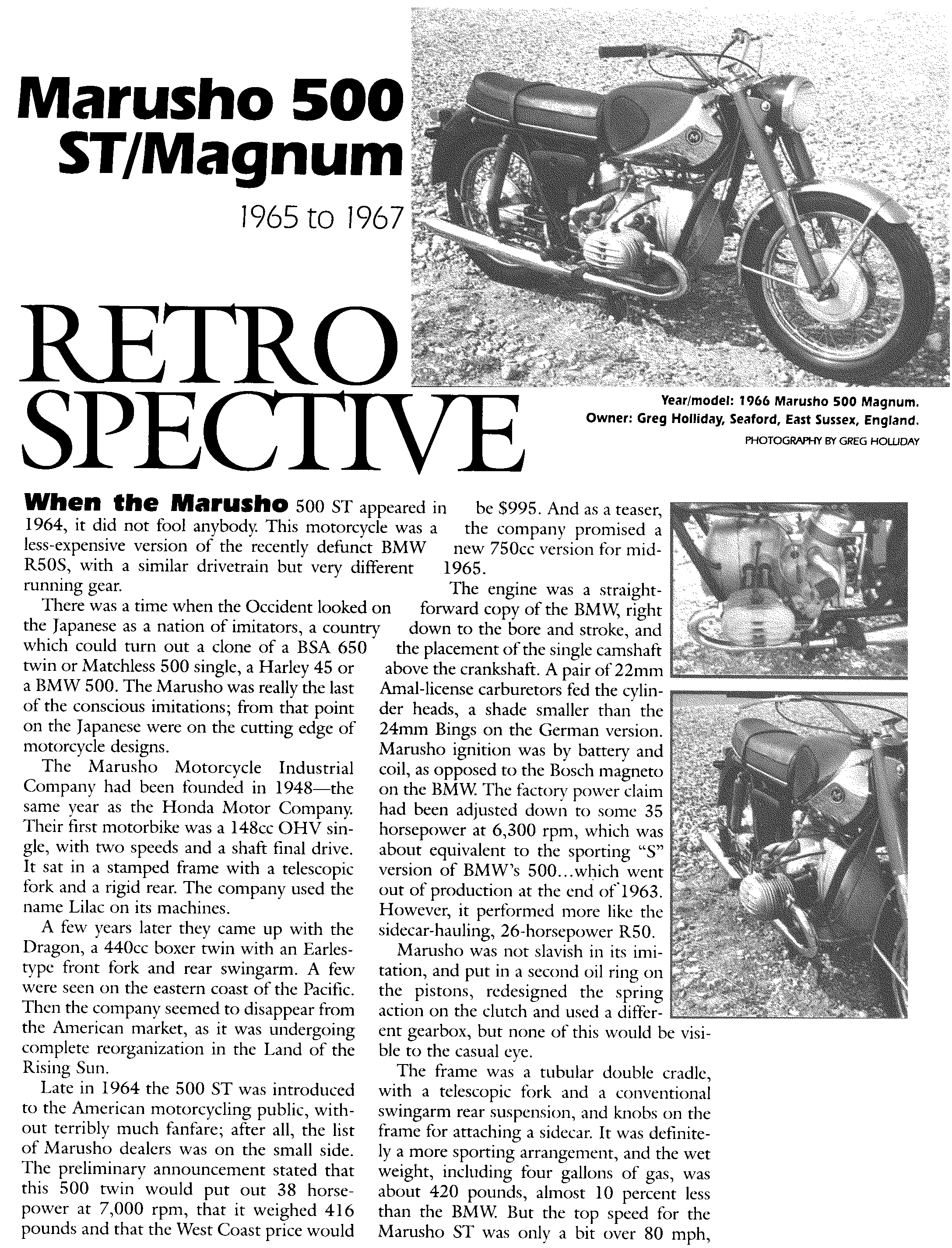 Rider Magazine Article 'Marusho 500 ST/Magnum Retrospective', Oct. '99, reprinted with the kind permission of the author, Clement Salvadori and Rider Magazine. Both pages are 2-bit (black and white) of 300dpi resolution. Photos on page 1 use diffusion dither, which is ideal for laser printing but unsuitable for on-screen viewing except at full-size. The original photos of the red and black Marusho are in color. Thanks to Troyce Walls for sending the scans.
