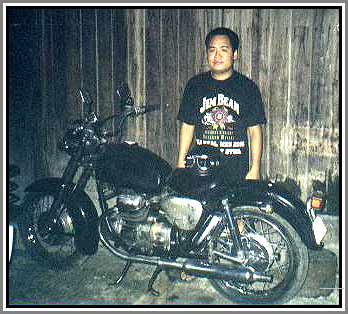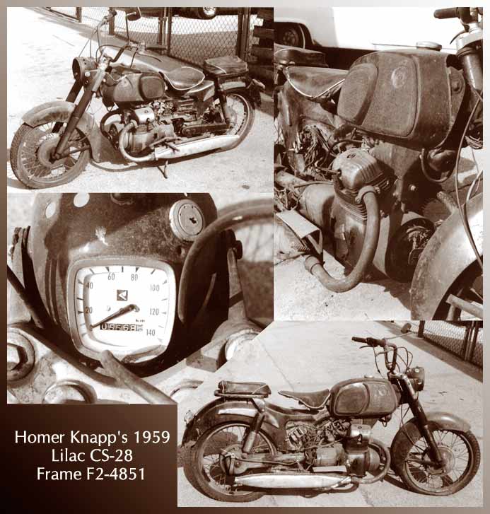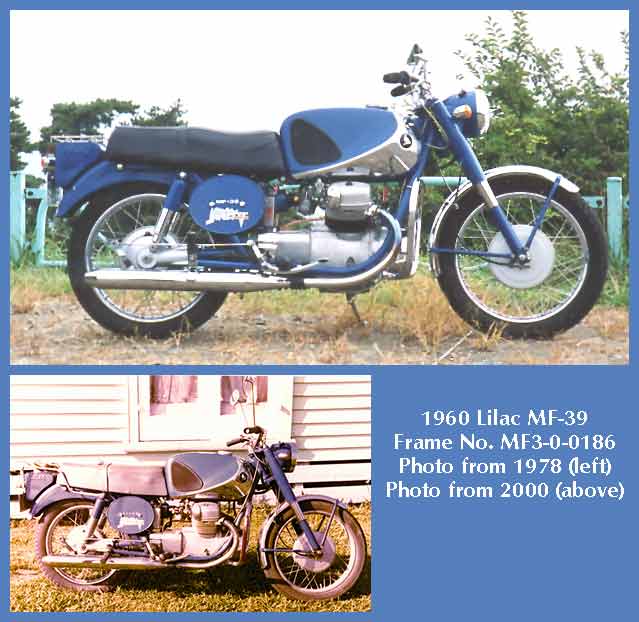 frame number F1-61-18054, engine E1-12345 (!!), as received from the previous owner in late 2000. It has high mileage for a Lilac - 45000 km - all done in three years 1961-64, so it must have been a very reliable bike. Photo by Mr. Machida.